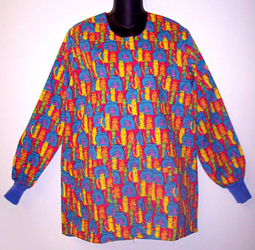 Long sleeved, rounded neckline, Ladies snap front Scrub jacket with 2 bottom pockets & elastic cuffs. Available in 5 sizes. Made by Hice Sewing, INC. New straight from the factory!